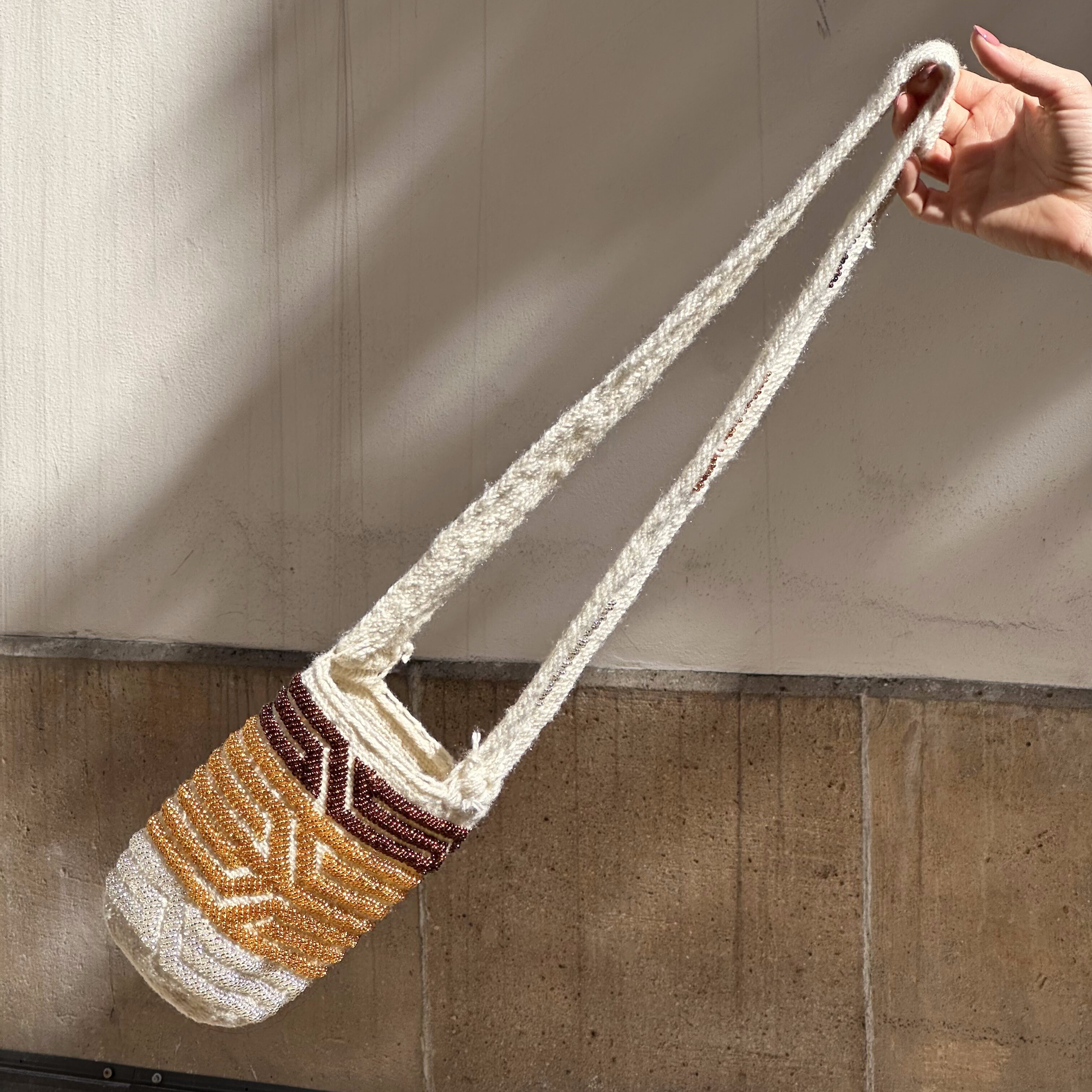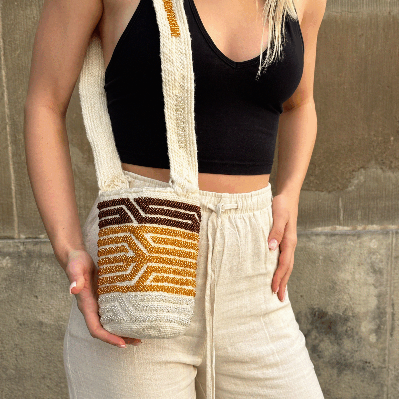 Ta wyjątkowa torba Kankuama to prawdziwe dzieło sztuki stworzone przez rzemieślników z rdzennej społeczności Kankuamo, mieszkającej w Sierra Nevada de Santa Marta w Kolumbii. Każdy egzemplarz jest tkany ręcznie z naturalnej wełny przy użyciu tradycyjnych technik przekazywanych z pokolenia na pokolenie.