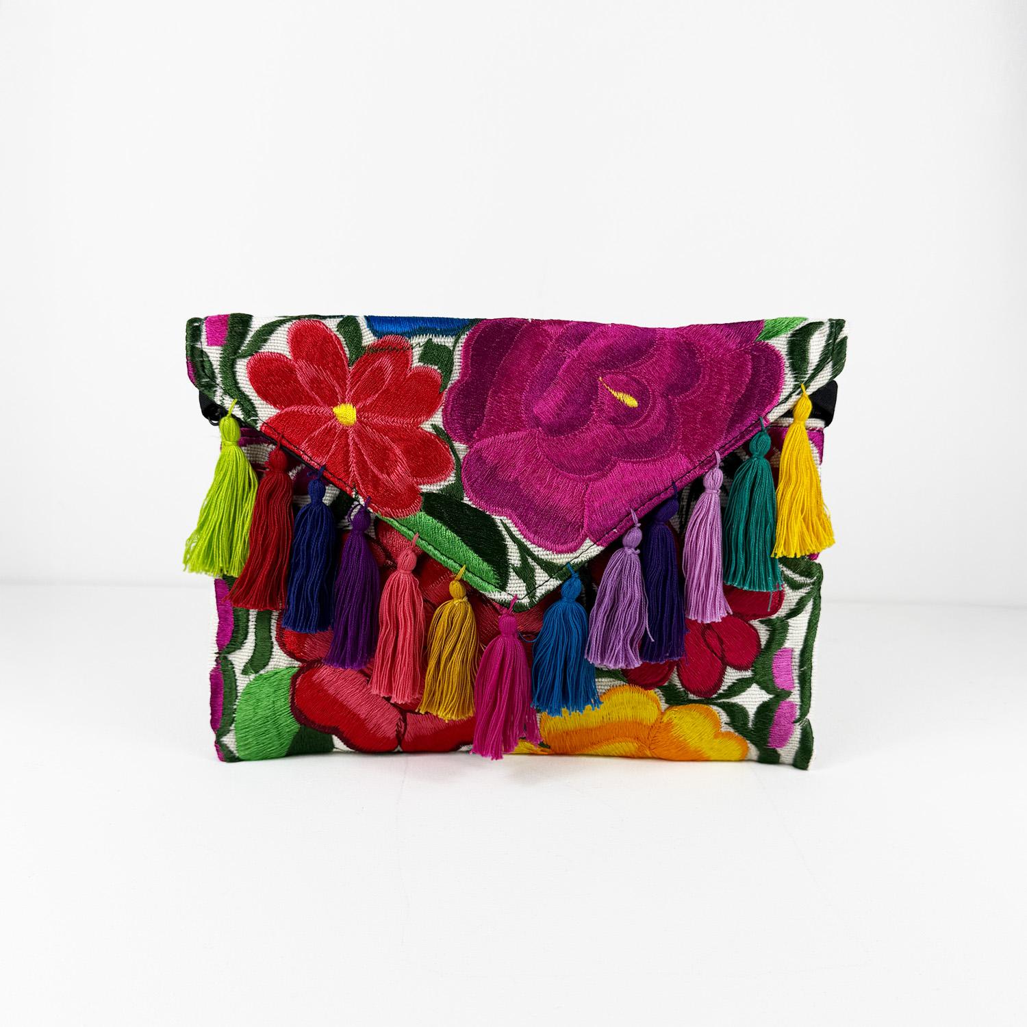 Frida jest w całości haftowana kolorowymi kwiatowymi wzorami co nadaje jej wyjątkowy charakter. Kopertówkę zdobią bawełniane frędzle – każdy wykonany indywidualnie nadając jej artystycznego charakteru, a zapięcie na magnetyczny zatrzask subtelnie podkreśla jej elegancję i funkcjonalność. Wnętrze jest wyłożone czarną podszewką, a dodatek stanowi odpinany łańcuszek w kolorze czarnego niklu, co pozwala nosić ją zarówno jako torebkę na ramię jak i stylową kopertówkę.