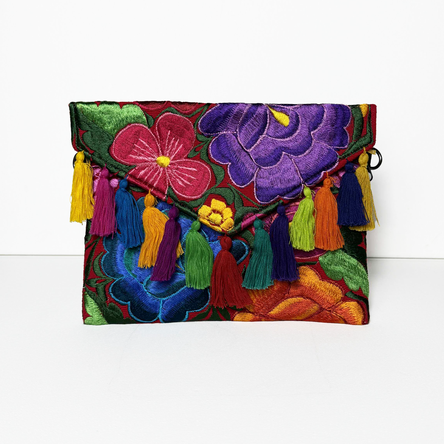 Frida jest w całości haftowana kolorowymi kwiatowymi wzorami co nadaje jej wyjątkowy charakter. Kopertówkę zdobią bawełniane frędzle – każdy wykonany indywidualnie nadając jej artystycznego charakteru, a zapięcie na magnetyczny zatrzask subtelnie podkreśla jej elegancję i funkcjonalność. Wnętrze jest wyłożone czarną podszewką, a dodatek stanowi odpinany łańcuszek w kolorze czarnego niklu, co pozwala nosić ją zarówno jako torebkę na ramię jak i stylową kopertówkę.