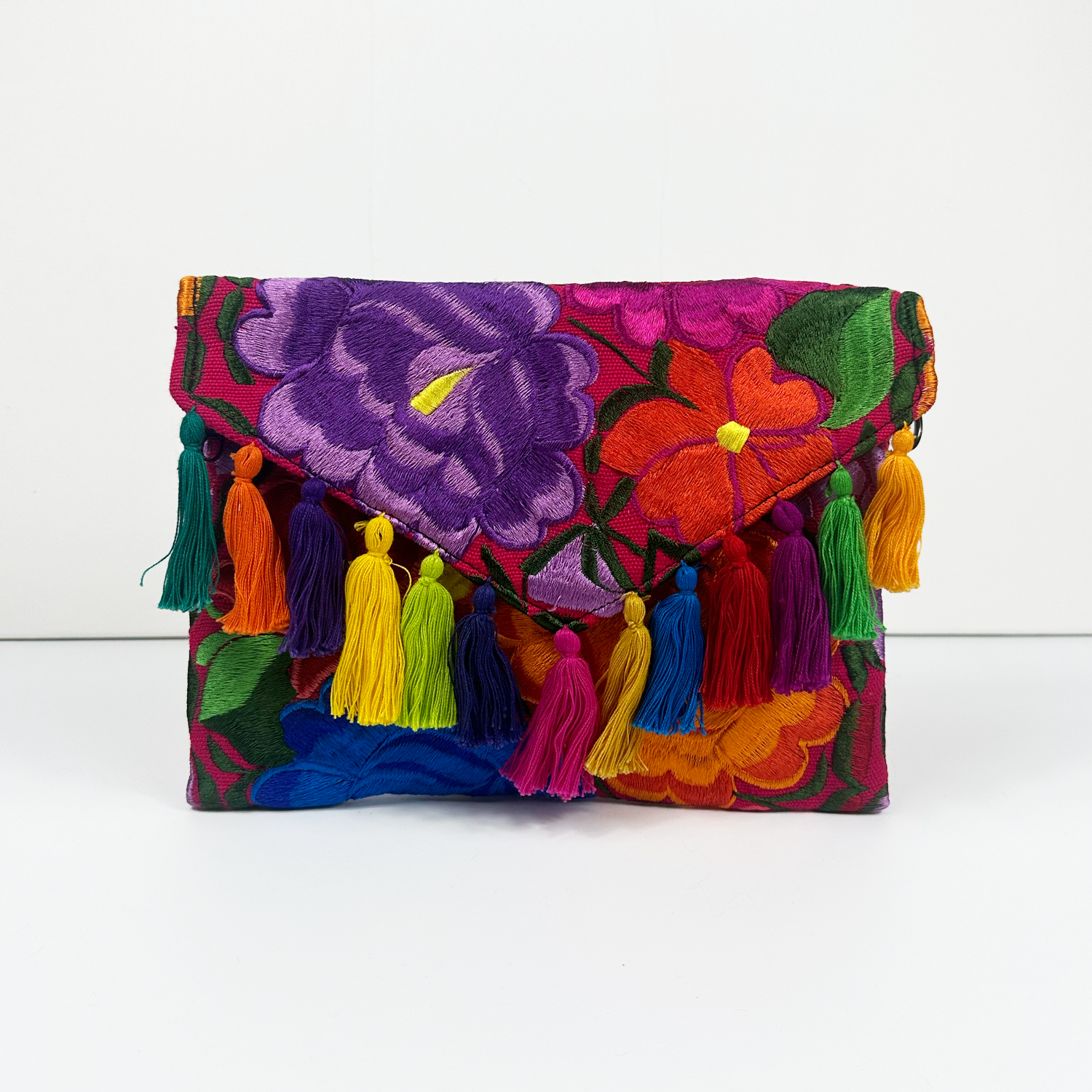 Frida jest w całości haftowana kolorowymi kwiatowymi wzorami co nadaje jej wyjątkowy charakter. Kopertówkę zdobią bawełniane frędzle – każdy wykonany indywidualnie nadając jej artystycznego charakteru, a zapięcie na magnetyczny zatrzask subtelnie podkreśla jej elegancję i funkcjonalność. Wnętrze jest wyłożone czarną podszewką, a dodatek stanowi odpinany łańcuszek w kolorze czarnego niklu, co pozwala nosić ją zarówno jako torebkę na ramię jak i stylową kopertówkę.