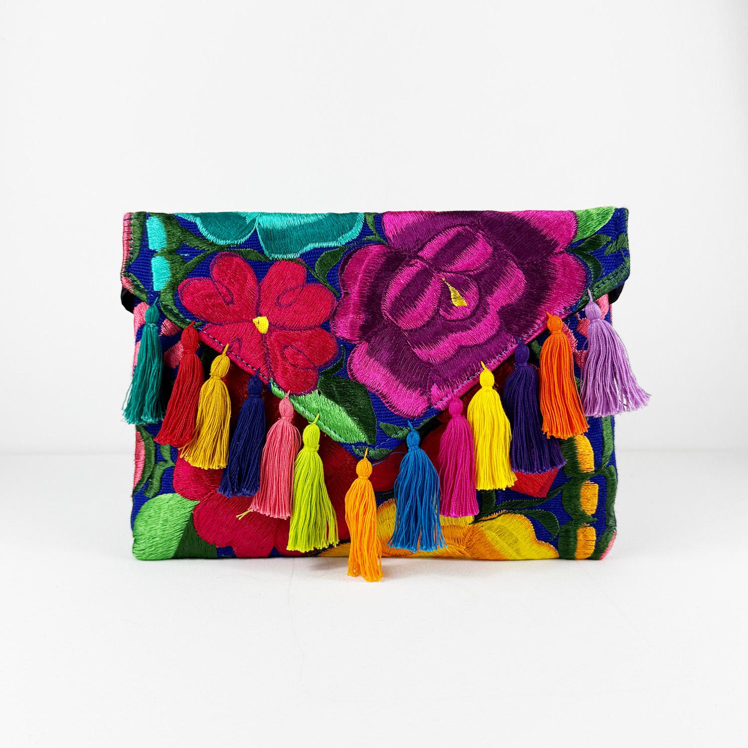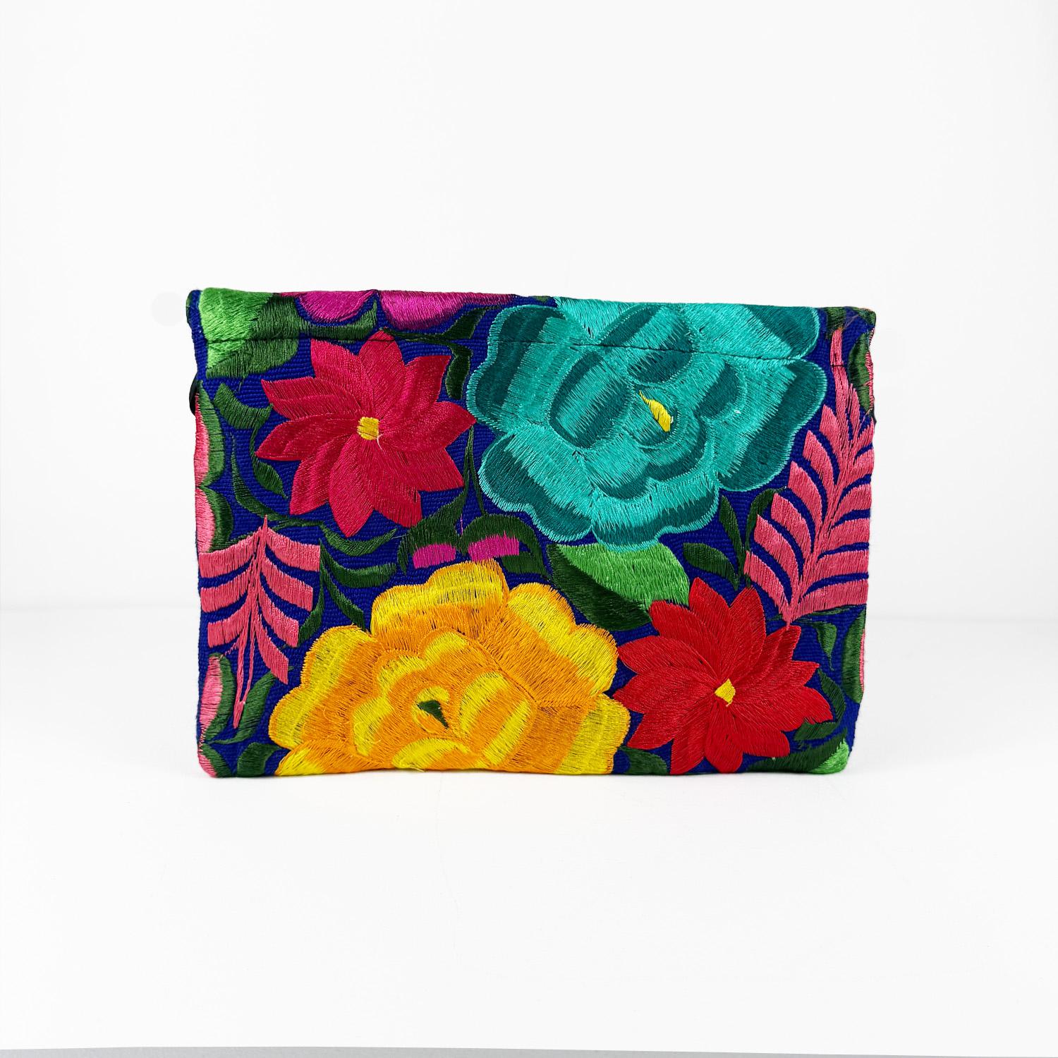 Frida jest w całości haftowana kolorowymi kwiatowymi wzorami co nadaje jej wyjątkowy charakter. Kopertówkę zdobią bawełniane frędzle – każdy wykonany indywidualnie nadając jej artystycznego charakteru, a zapięcie na magnetyczny zatrzask subtelnie podkreśla jej elegancję i funkcjonalność. Wnętrze jest wyłożone czarną podszewką, a dodatek stanowi odpinany łańcuszek w kolorze czarnego niklu, co pozwala nosić ją zarówno jako torebkę na ramię jak i stylową kopertówkę.