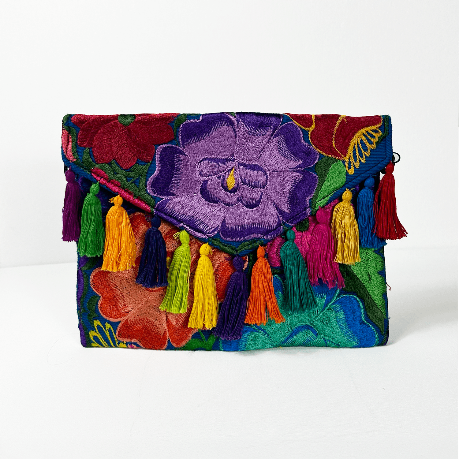 Frida jest w całości haftowana kolorowymi kwiatowymi wzorami co nadaje jej wyjątkowy charakter. Kopertówkę zdobią bawełniane frędzle – każdy wykonany indywidualnie nadając jej artystycznego charakteru, a zapięcie na magnetyczny zatrzask subtelnie podkreśla jej elegancję i funkcjonalność. Wnętrze jest wyłożone czarną podszewką, a dodatek stanowi odpinany łańcuszek w kolorze czarnego niklu, co pozwala nosić ją zarówno jako torebkę na ramię jak i stylową kopertówkę.