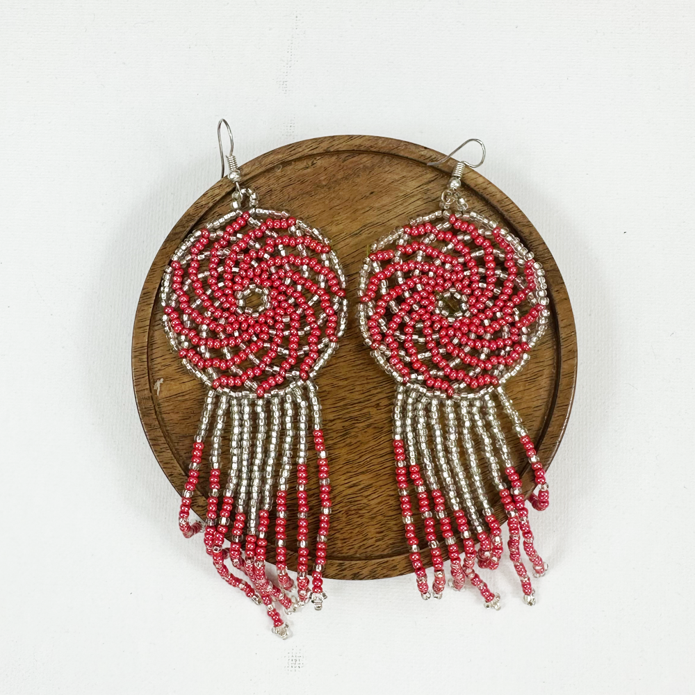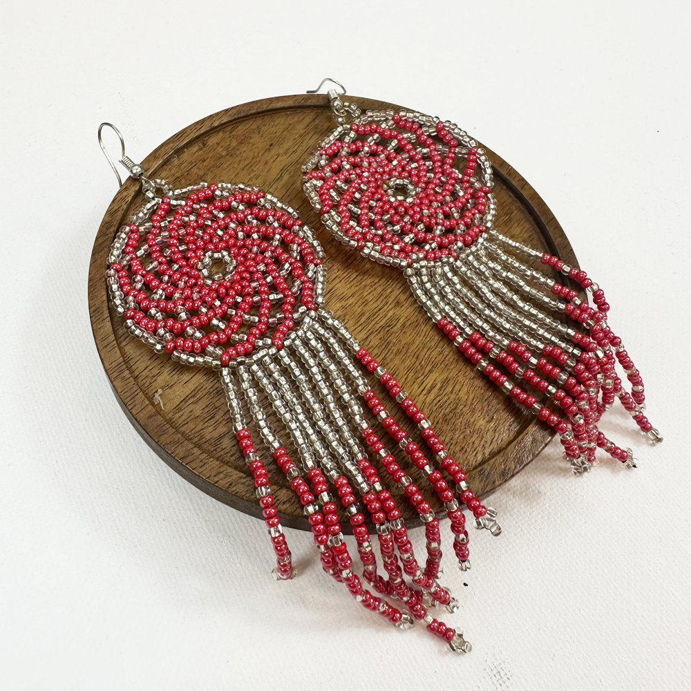 Każdy detal został wykonany z niezwykłą precyzją z drobnych koralików, układających się w harmonijną, okrągłą formę. Długie, miękko opadające frędzle nadają kolczykom lekkości i ruchu, pięknie podkreślając szyję przy każdym kroku.