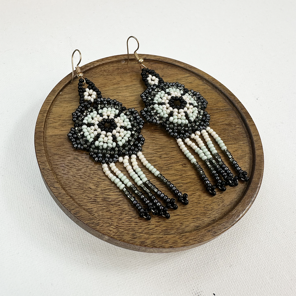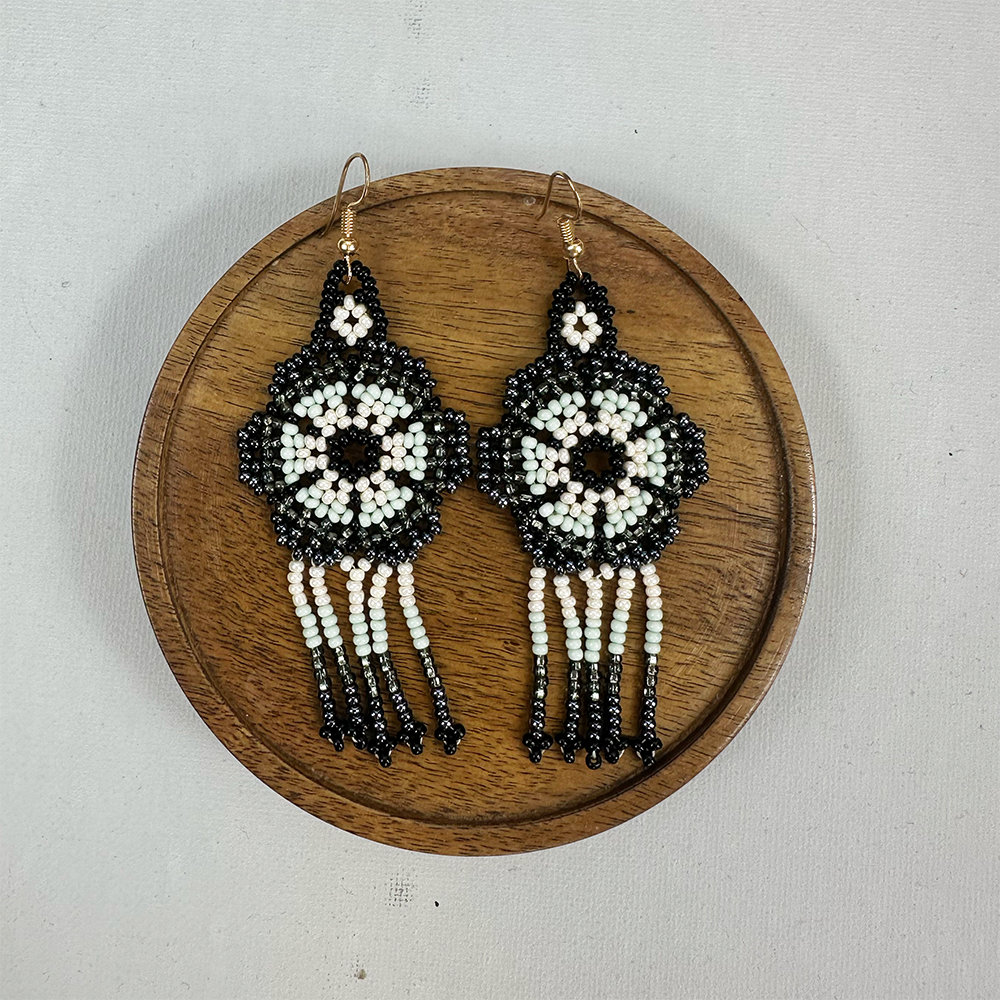 Zanurz się w kolorze i radości dzięki tym wyjątkowym kolczykom ręcznie tworzonym w Meksyku. Misternie wykonane z drobnych koralików, zachwycają kwiatowym wzorem w odcieniach czerni, bieli i błękitnego, który przyciąga wzrok i dodaje energii każdej stylizacji. Centralny motyw przypomina rozkwitający kwiat – symbol piękna, życia i kobiecej siły.