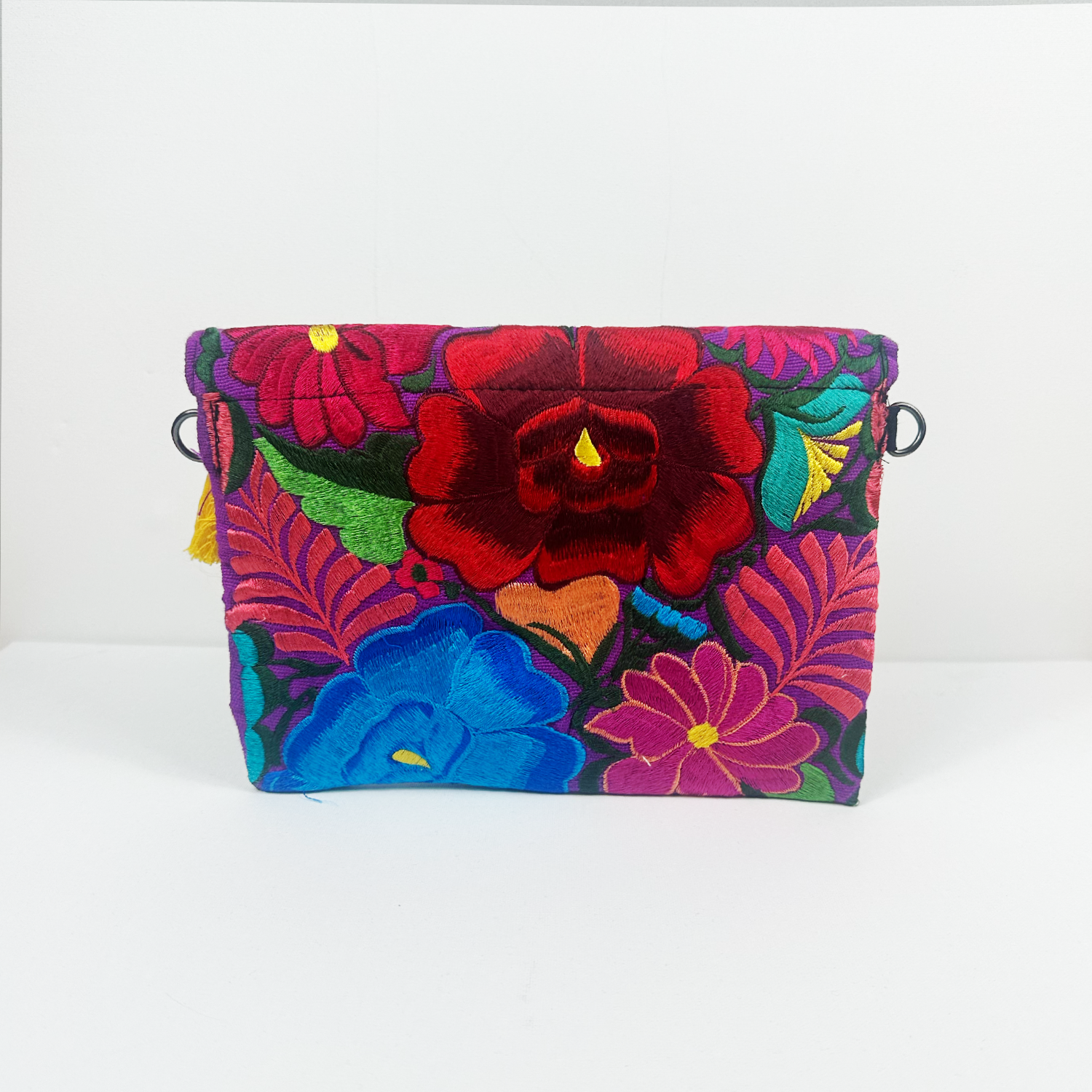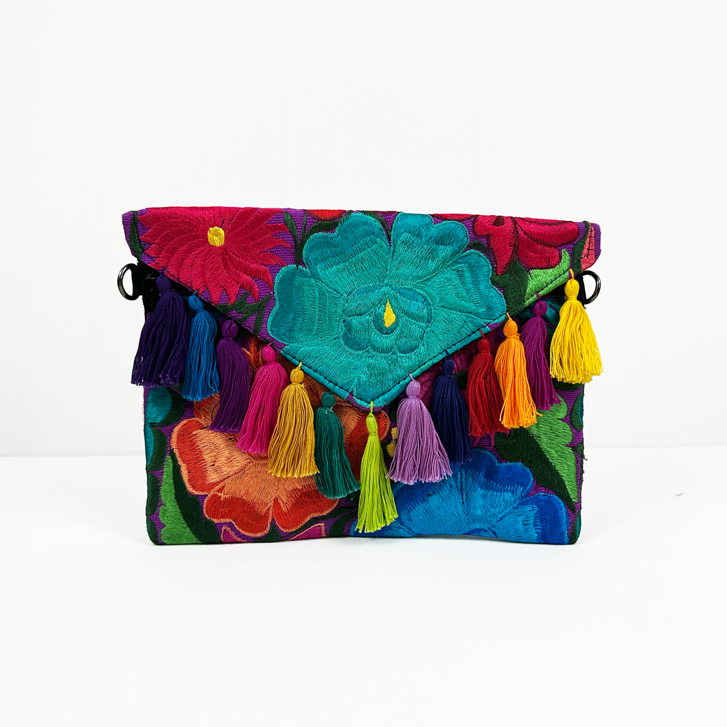 Kopertówka jest w całości haftowana kolorowymi kwiatowymi wzorami co nadaje jej wyjątkowy charakter. Zdobią ją bawełniane frędzle – każdy wykonany indywidualnie nadając jej artystycznego charakteru, a zapięcie na magnetyczny zatrzask subtelnie podkreśla jej elegancję i funkcjonalność. Wnętrze jest wyłożone czarną podszewką, a dodatek stanowi odpinany łańcuszek w kolorze czarnego niklu, co pozwala nosić ją zarówno jako torebkę na ramię jak i stylową kopertówkę.