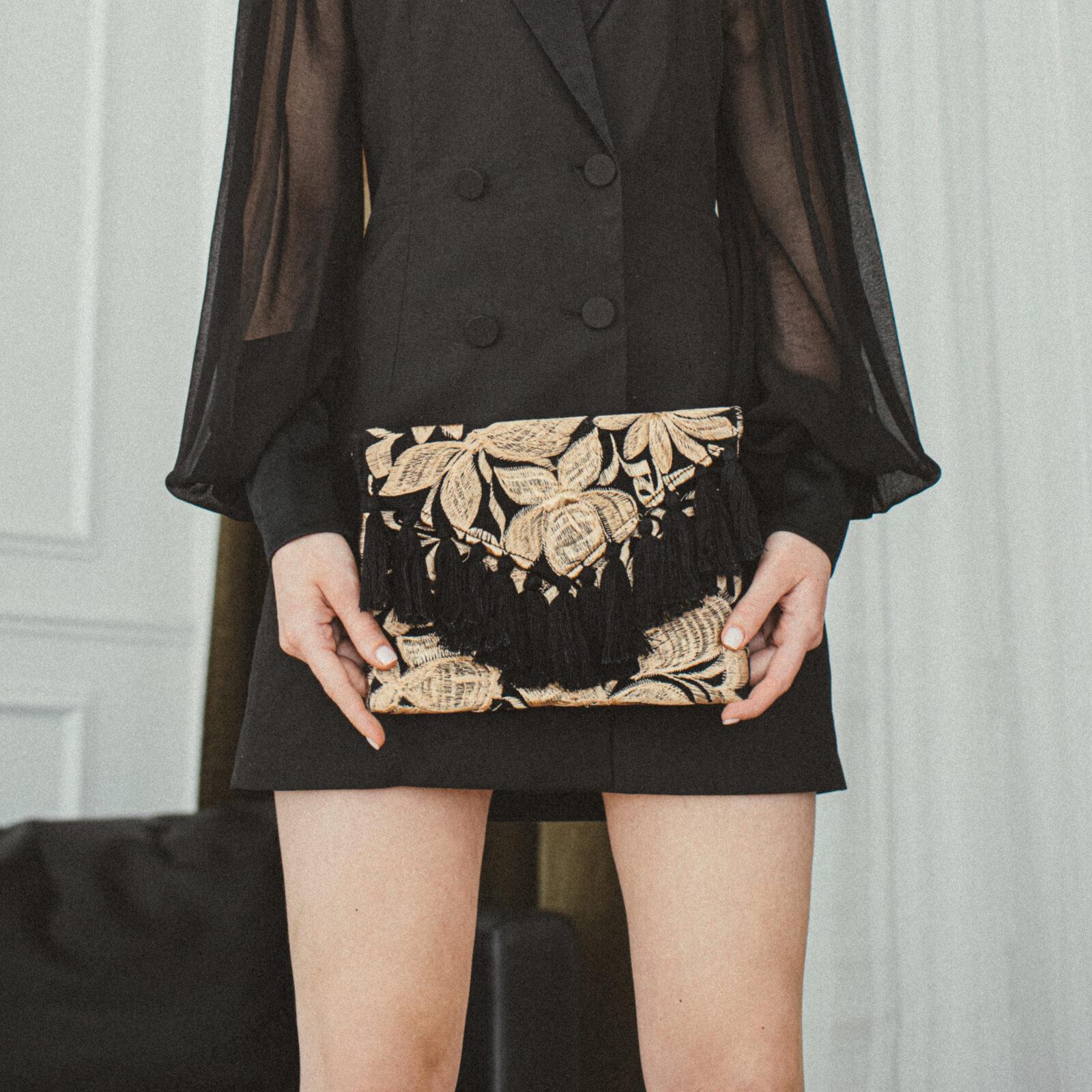 Jak wygląda kopertówka? Torebka jest w całości haftowana kolorowymi kwiatowymi wzorami, co nadaje jej wyjątkowy charakter. Dodatkowo zdobią ją zwisające frędzle. Zamykana jest na magnetyczny zatrzask, a wnętrze wyłożone jest czarną podszewką z poliestru. Torebka wyposażona jest w łańcuszek w kolorze czarnego niklu, który można odpiąć, gdy nie jest używany.