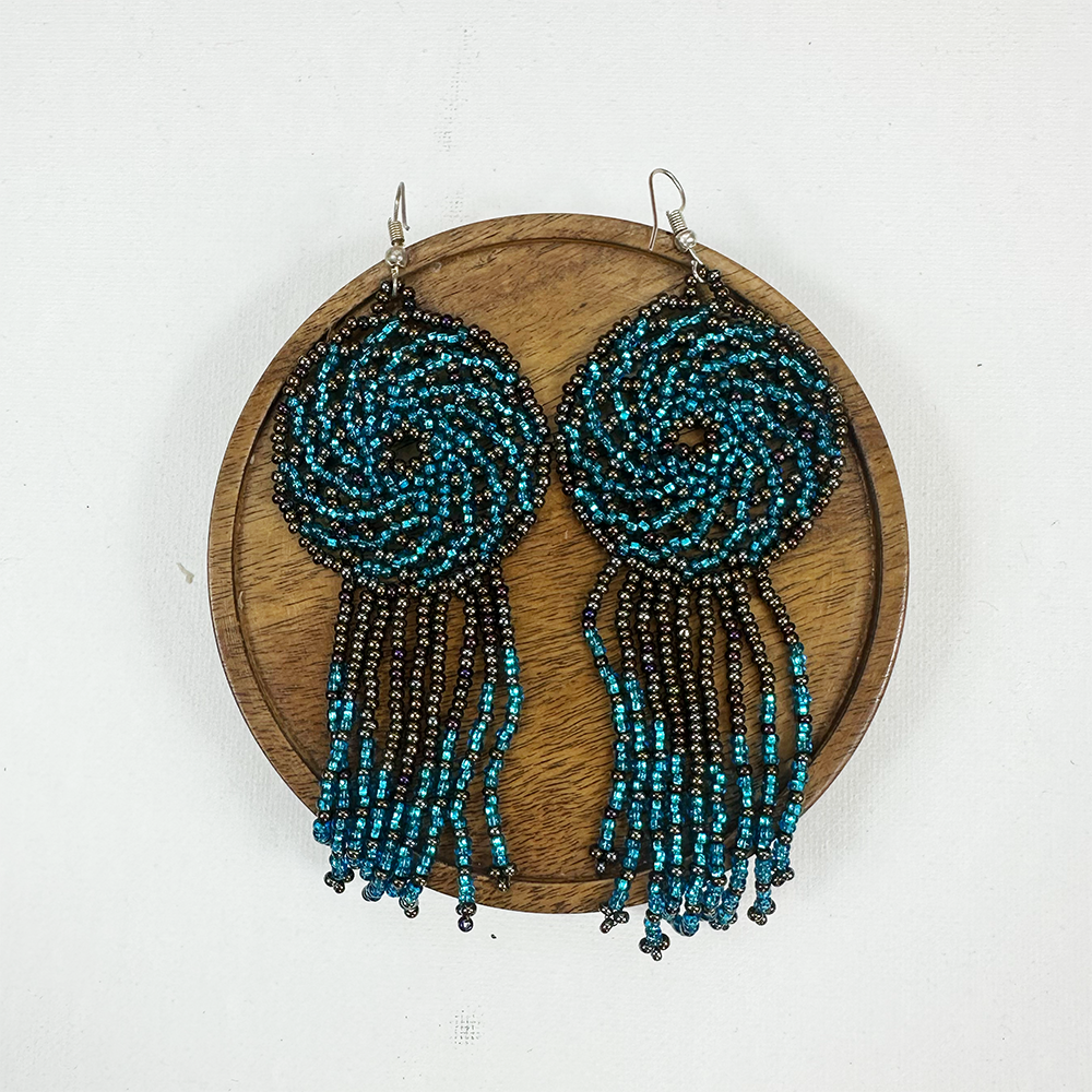 Każdy detal został wykonany z niezwykłą precyzją z drobnych koralików, układających się w harmonijną, okrągłą formę. Długie, miękko opadające frędzle nadają kolczykom lekkości i ruchu, pięknie podkreślając szyję przy każdym kroku.