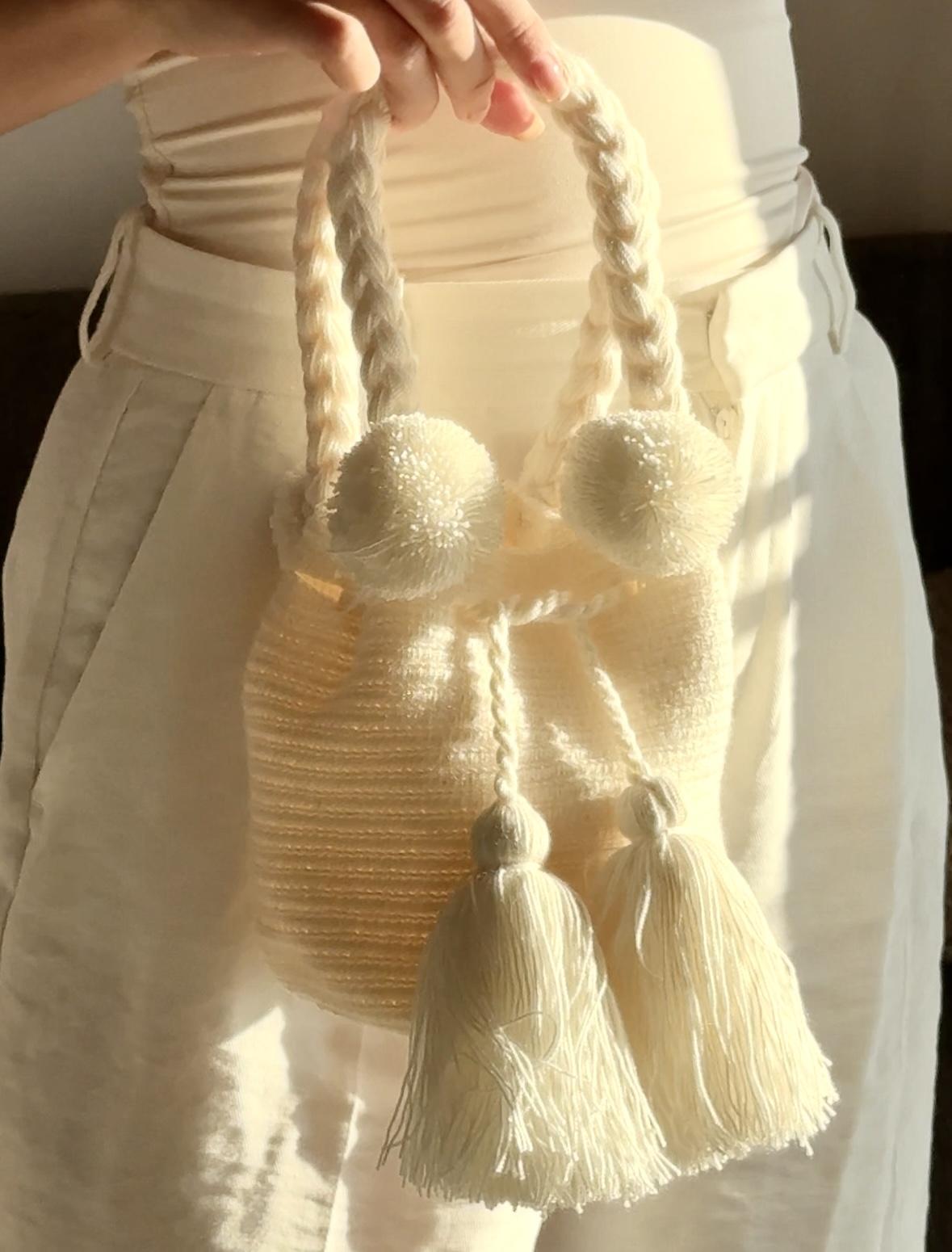 Każda mini torebka Wayuu jest szydełkowana przez jednego rzemieślnika przez około 5-8 dni, z wykorzystaniem tradycyjnej techniki podwójnej nitki. Dzięki temu torebki są jednocześnie lekkie i trwałe, a ich struktura zachowuje kształt nawet przy codziennym użytkowaniu. Każdy splot, detal i kolor opowiada historię pracy ludzkich rąk oraz wielowiekowej tradycji.